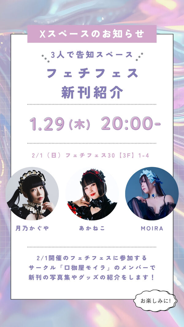 おはようございます❣本日、フェチフェスに参加いたします。フェチでサブカルなサークル「口枷屋モイラ」は3階の01~04にて、MOIRA、あかねこ、月乃かぐやがお待…